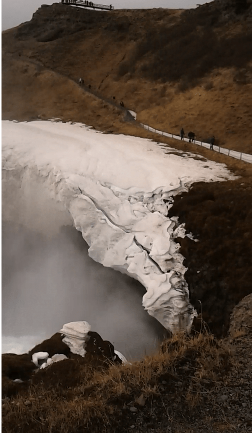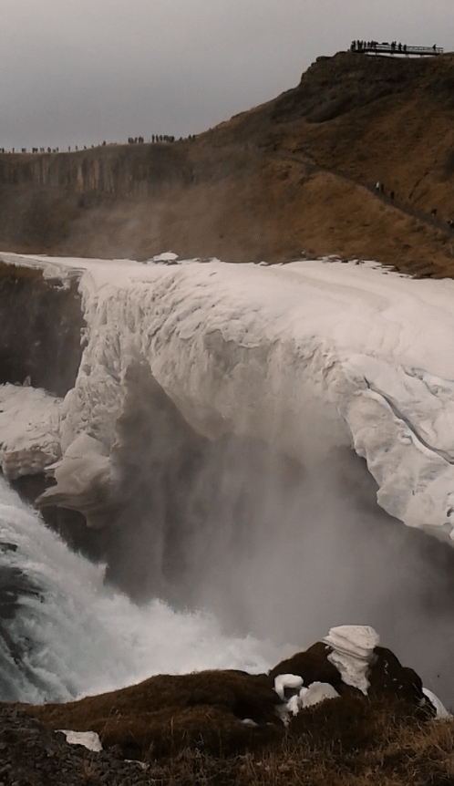 Eu una n-am zărit nici perdea aurie, nici irizări rainbow, dar mi-a plăcut mult Gullfoss. Chiar și in culori mai banale, tot arăta maiestuos. Erau, practic, trei cascade într-una, apa se prăvălea pe trei niveluri, cu o forță incredibilă (și un huruit pe potrivă). Malurile erau încă înghețate, iar apa trebuie să fi fost foarte rece și ea, judecând după aerul glaciar pe care îl răspândea.