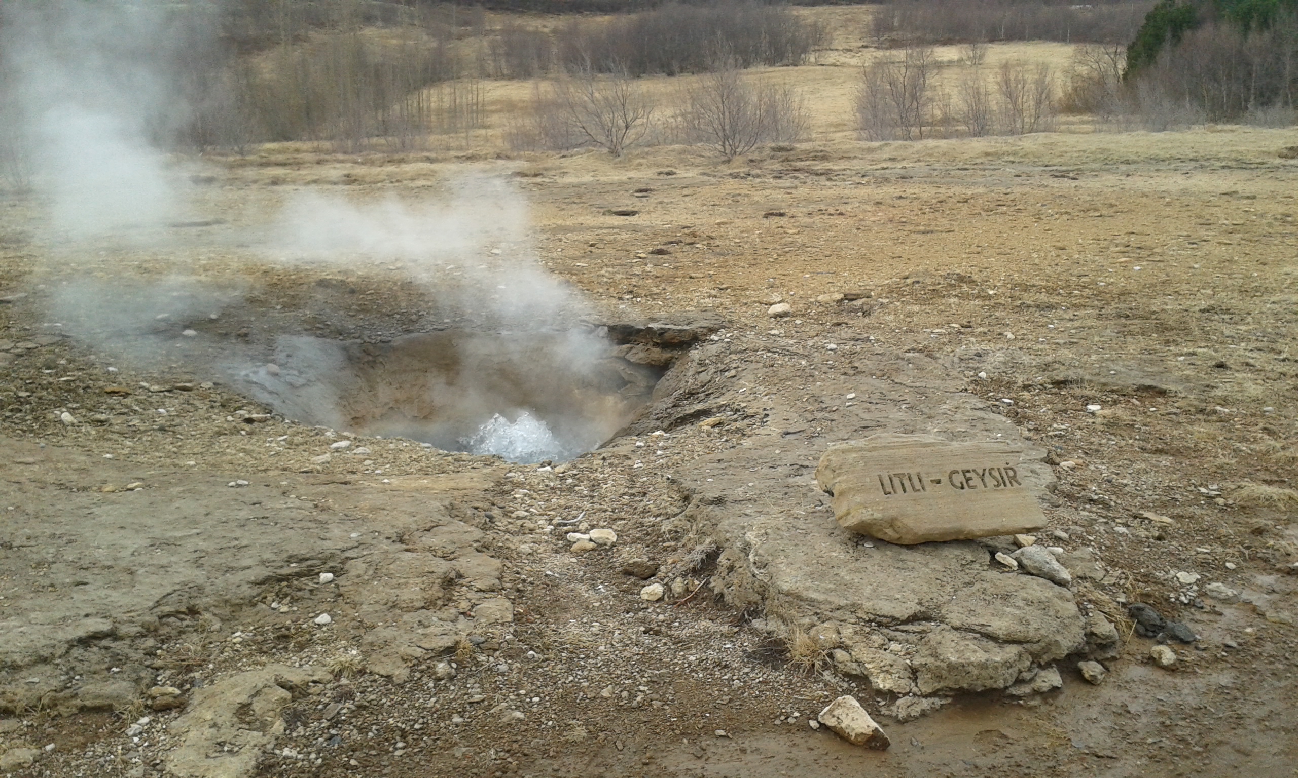 Urcând pe munte, am dat nas în nas cu Litli Geysir. Mic, dar vânjos, bolborosea și nu se dădea bătut, chiar dacă mai mult de câțiva centimetri nu izbutea să erupă. Era adorabil, un pui de gheizer. Pe vremuri, arunca în aer un jet de 6-9 m; acum, cât pe ce să calc în el: nici nu-l văzusem, atât era de mititel… dar rămăsese, totuși, unul din cele două gheizere active din această zonă geotermală.