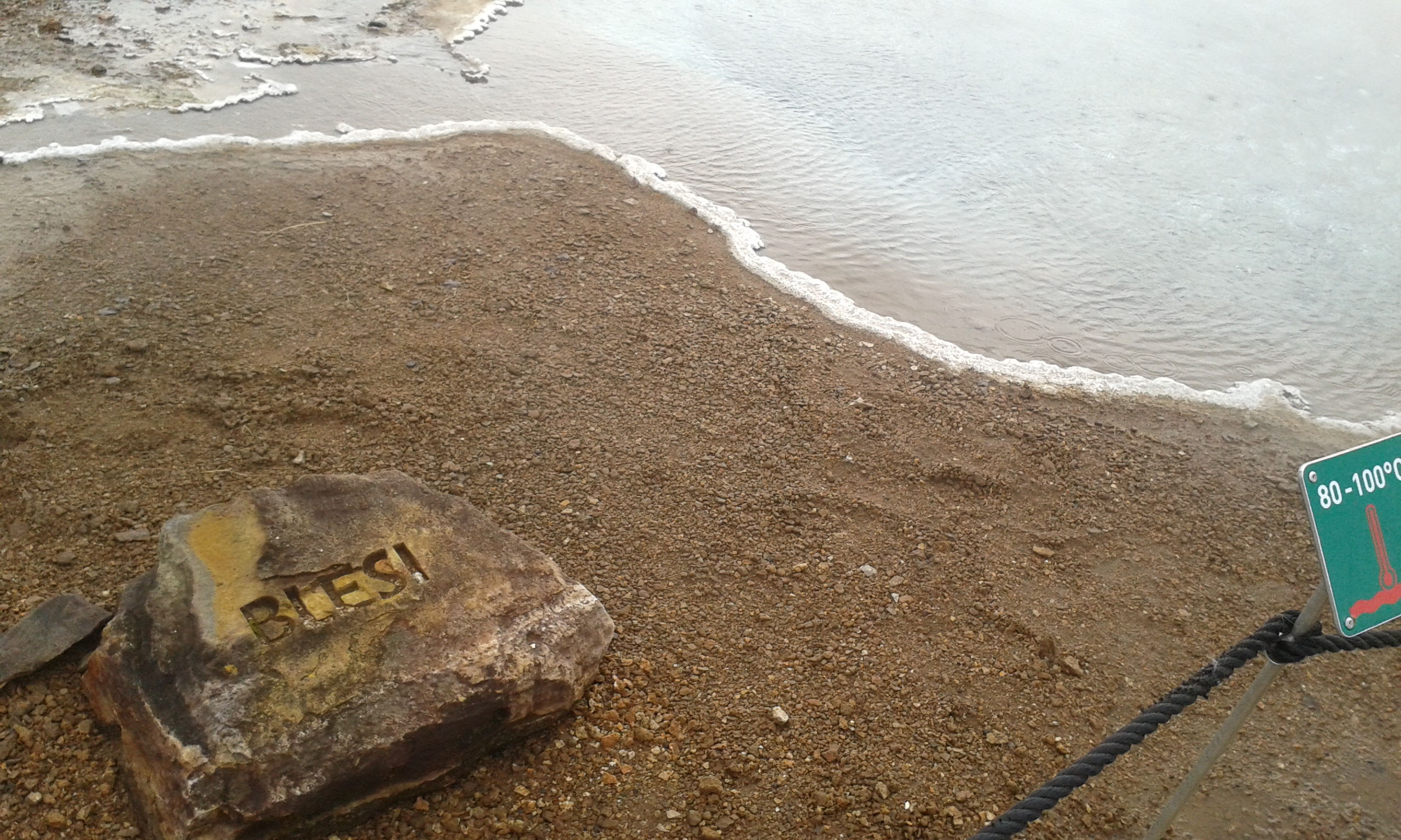 Mai sus de Strokkur, se află Blesi, un izvor hidrotermal care nu erupe niciodată, dar care e renumit pentru culoarea lui, un albastru diafan, suprarealist. Culoarea e poetică, originea, mai puțin: se datorează prezenței unor bacterii hipertermofile, care rezistă la temperaturi ridicate. Blesi e format din două ochiuri de apă conectate, care au nuanțe diferite de albastru și temperaturi diferite (cel nordic are 40 grade, iar cel sudic, 80-100 grade). Pe vremuri, localnicii își încălzeau mâncarea, în bain-marie, în apa izvorului nordic… În timp ce îl contemplam, un val de abur cu miros de sulf s-a ridicat din el și vântul l-a împins spre mine. În câteva clipe, până am apucat să mă feresc, mi-a împroșcat geaca cu pete albe, care s-au dovedit apoi foarte greu de scos. Nu-i de mirare, la câtă concentrație de minerale se găsește în apa de aici (în orice stare de agregare), că până și gheizerele se înfundă…