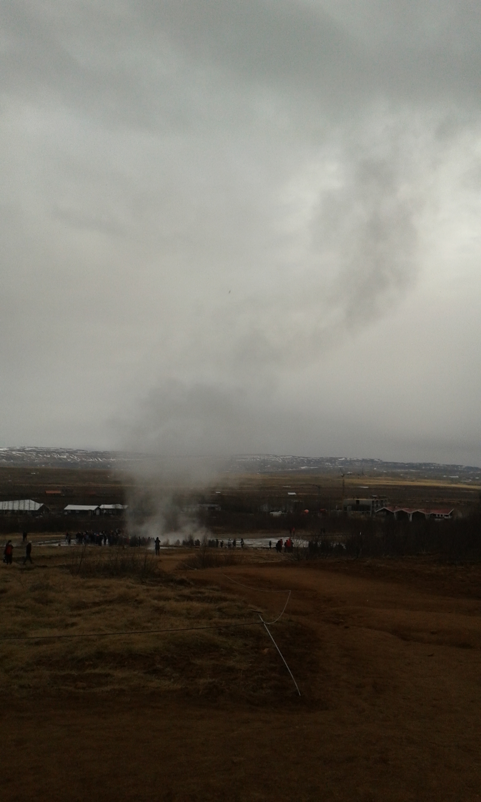Întorcându-mă spre autocar, am zis să mai fac o ultimă fotografie cu zona geotermală, când Strokkur a erupt, deodată, chiar în dreptul obiectivului. De uimire, am mișcat mâna și a intrat și unghia mea în cadru. E singura poză pe care o am cu un gheizer în erupție (am prins exact finalul exploziei), așa că o consider un fel de selfie. Măcar e o dovadă că am fost acolo, nu?