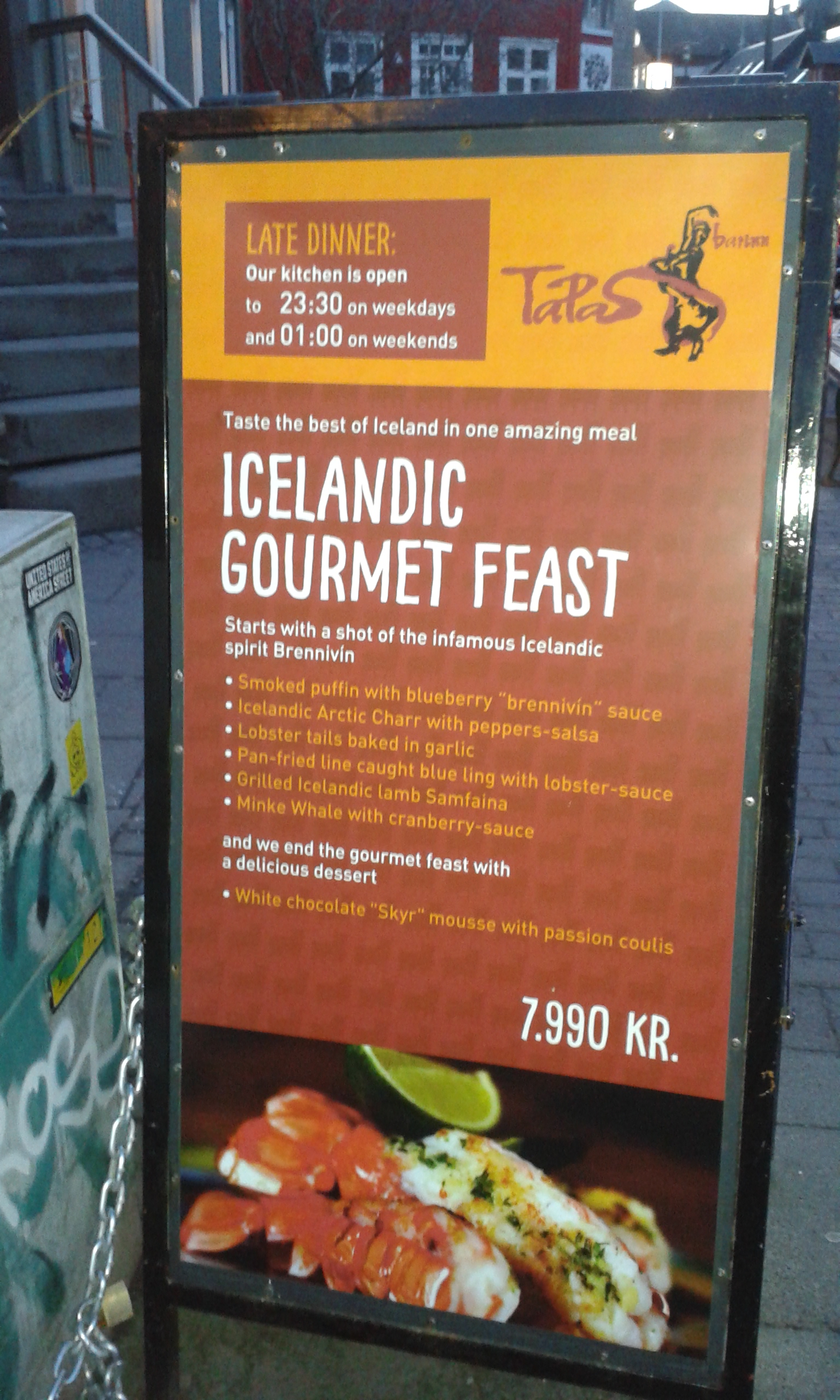 Cum ziceam și într-o postare anterioară, Islanda este cea mai scumpă țară din lume. Plecasem de acasă cu o diurnă cu care am fi putut lua trei mese pe zi la restaurant, în București, dar acolo abia de ne ajungea pentru un prânz la Bergsson, un bistro mai ieftin cu meniu fix. Așa am învățat, în modul cel mai practic, sensul cuvântului „svangur” (foame). Noroc că exista Bonus, supermarket-ul cu prețuri reduse, de unde ne aprovizionam cu skyr-ul cel de toate zilele (un soi de iaurt islandez tradițional).