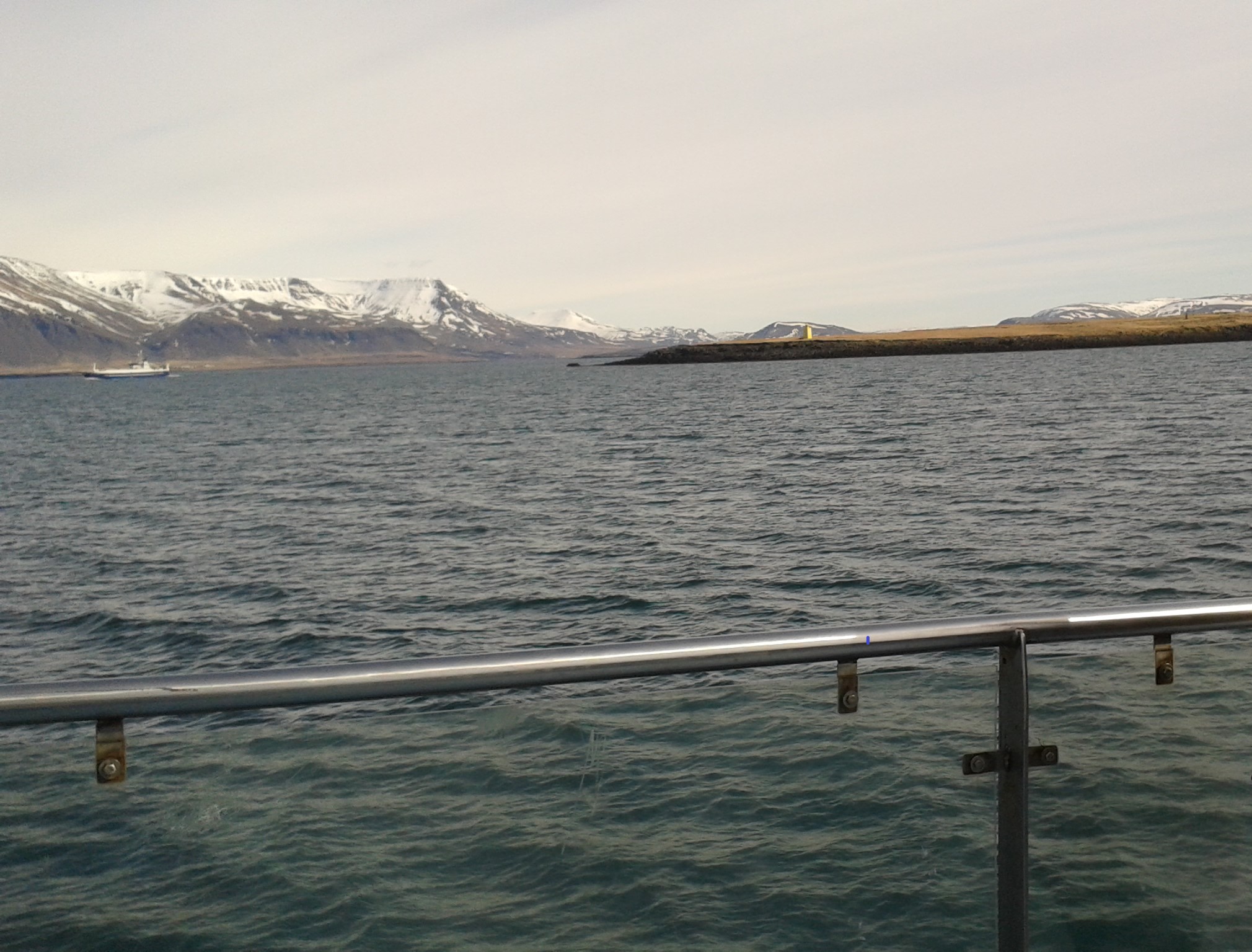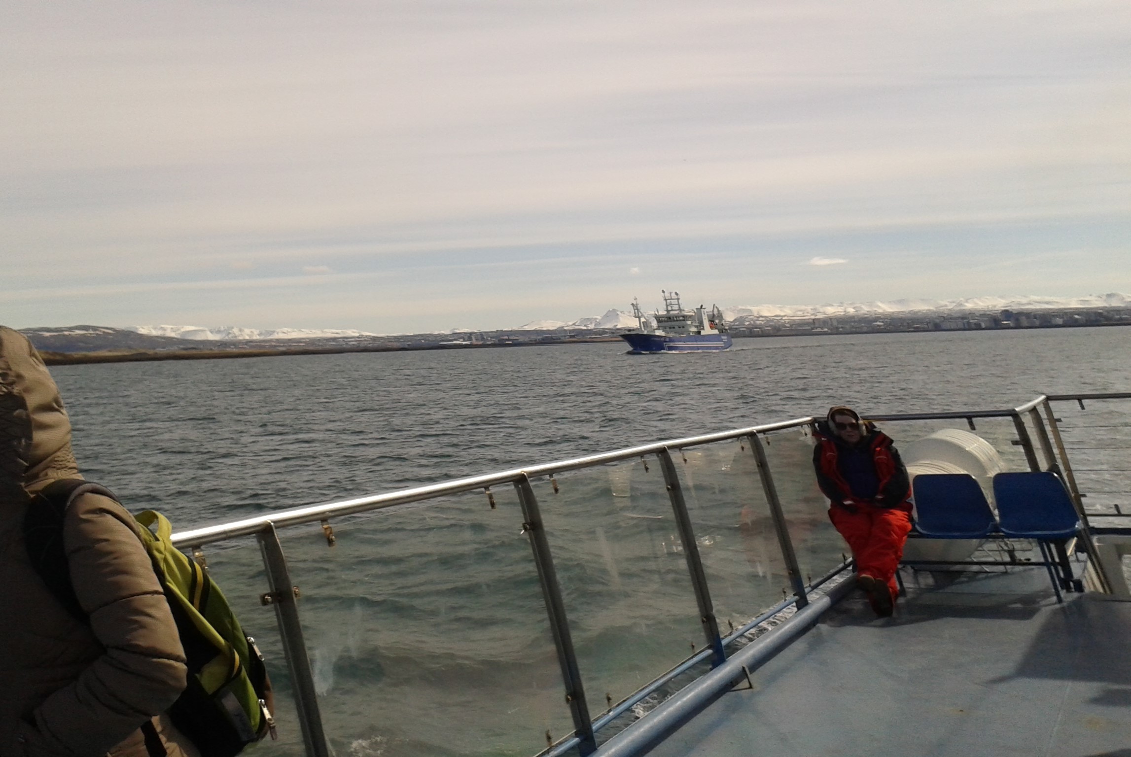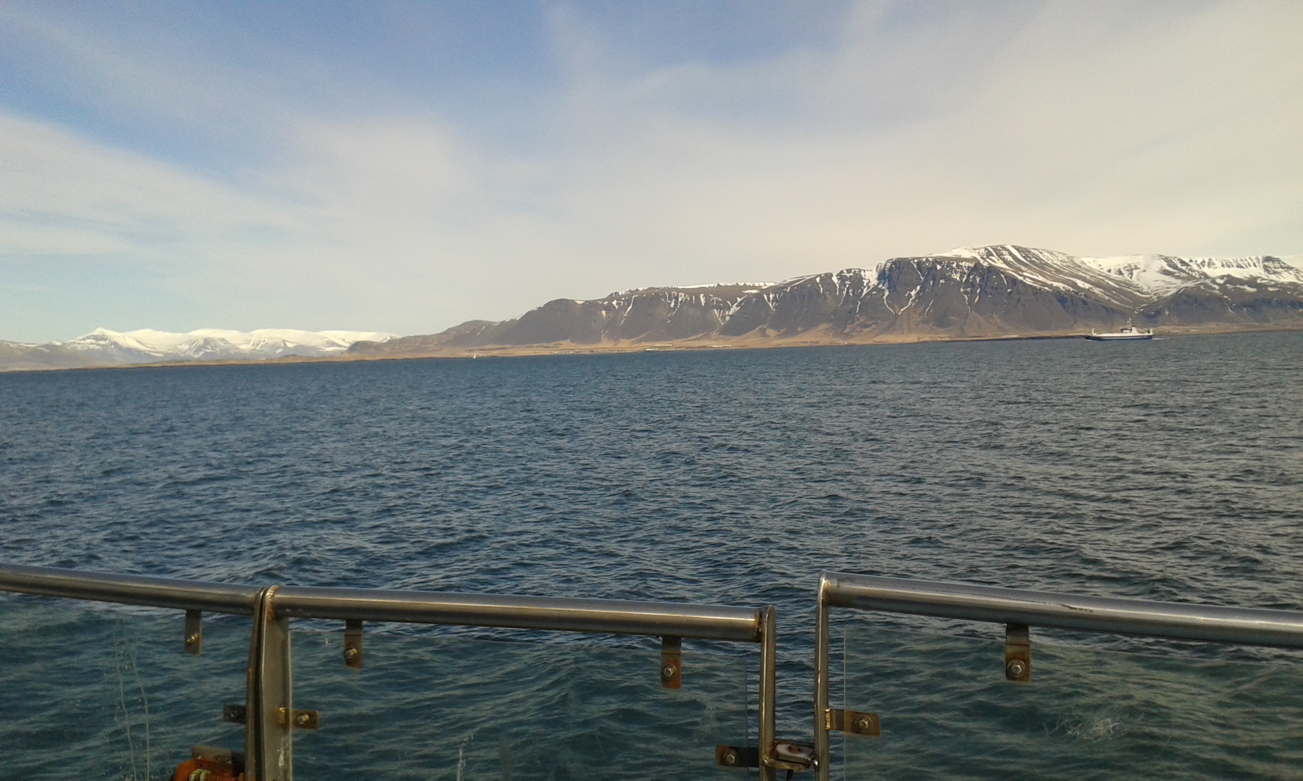 Așa că, duminică, într-o dimineață care se anunța la fel de însorită ca și cea dinainte, am dat o mică fugă la supermarket (ca să ne facem provizii, de parcă am fi plecat în expediție; nu știu de ce ne-am temut așa rău că aveam să murim de foame, în cam 2 ore de croazieră; poate că era un efect subliminal al grozăviilor care ne impresionaseră, la muzeu), și apoi am fugit și mai tare, până în port (căci ne-am trezit iar pe punctul de a întârzia), ne-am îmbarcat și duse am fost, pe apele Atlanticului… Vaporașul nu era luxuos deloc, avea mai degrabă un aer retro, de vas pescăresc, dar părea sprinten și putea fi manevrat foarte rapid (lucru care, după cum se va vedea, s-a dovedit a fi foarte util). José, ghidul nostru, un spaniol ajuns, cine știe cum, atât de aproape de Cercul Polar de Nord, părea incredibil de scund și de vorbăreț, în contrast total cu placizii islandezi cu care avusesem de-a face, până atunci. Se pricepea să creeze și să întrețină o atmosferă veselă și agreabilă, în grupul de turiști. El era încrezător în șansele noastre de a zări balene, dar eu nici nu mă gândeam la asta, ca să nu fiu dezamăgită, la final, dacă nu avea să se întâmple. Am preferat să mă sprijin de balustradă și să privesc peisajele pe care ni le oferea țărmul islandez.
