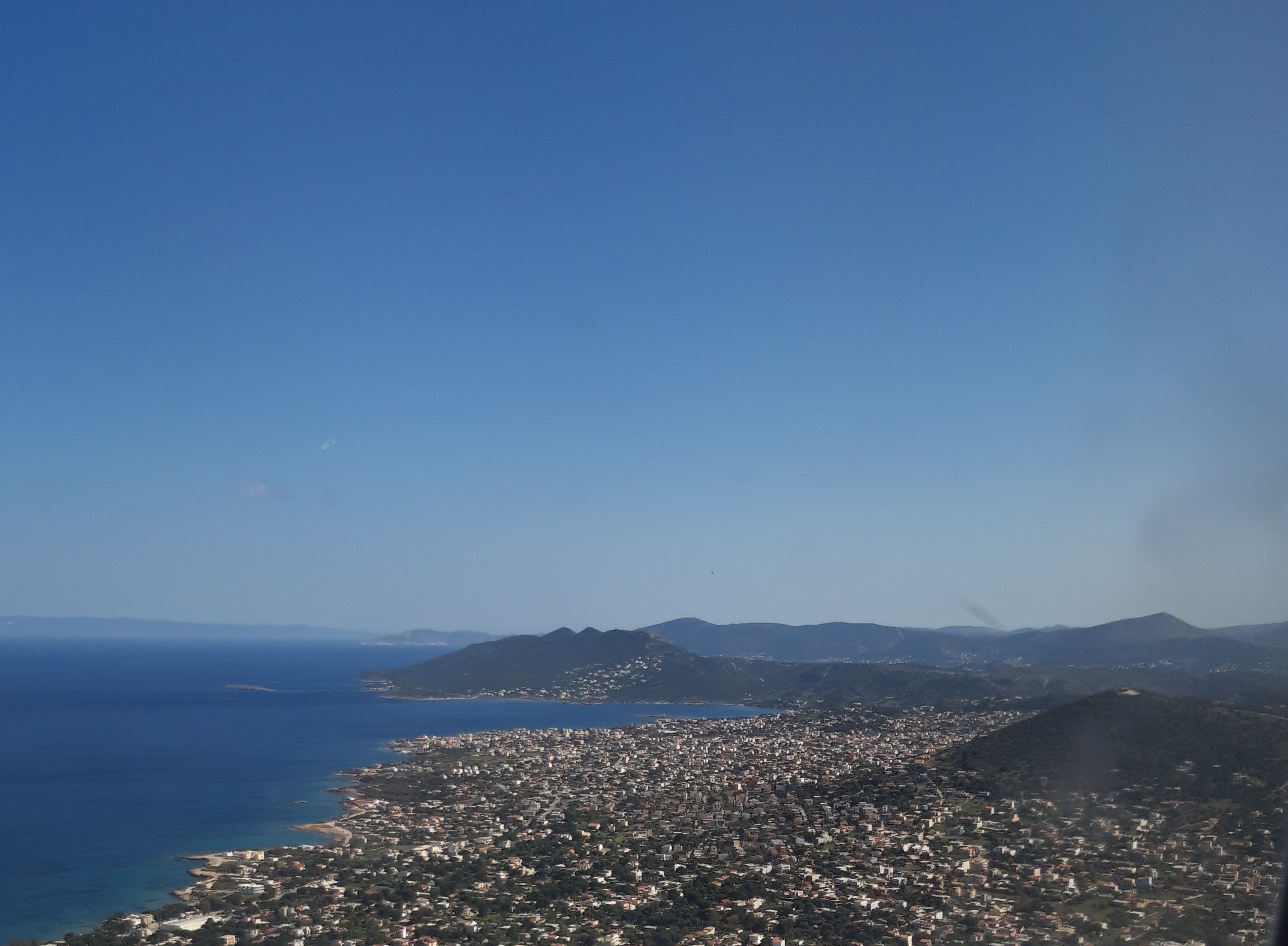 În scurt timp, a apărut la orizont și destinația noastră, înghesuită între munți și țărm… Și așa, vrăjită de frumusețea drumului, am aterizat la Atena. Ne-a întâmpinat o lumină blândă, aurie (în general, din câte am observat, cu cât latitudinea e mai sudică, cu atât e mai gălbuie lumina; cea din nord tinde să fie mai albă și mai dură; are, probabil, legătură cu unghiul sub care cad razele solare pe diverse regiuni ale Terrei).