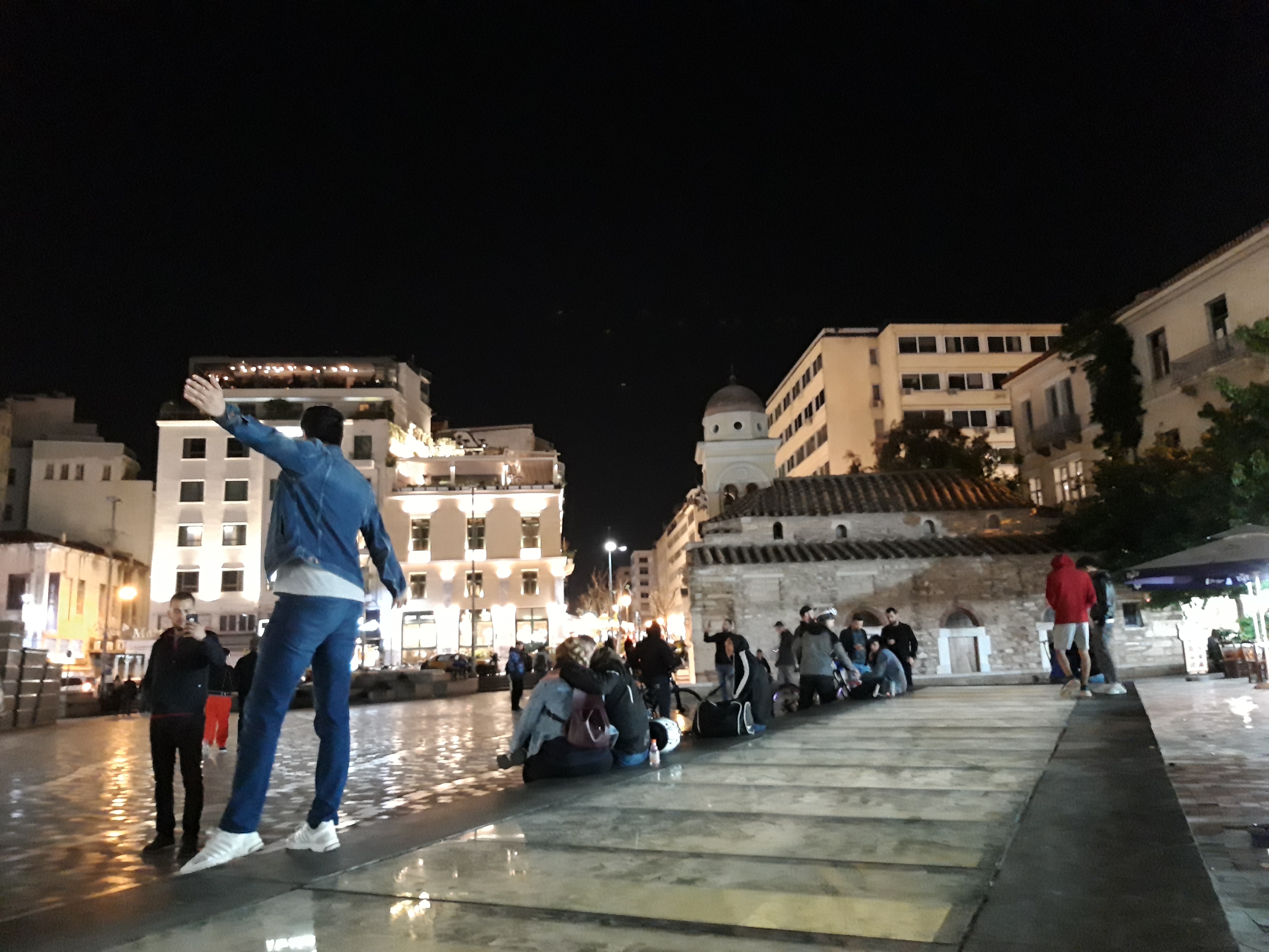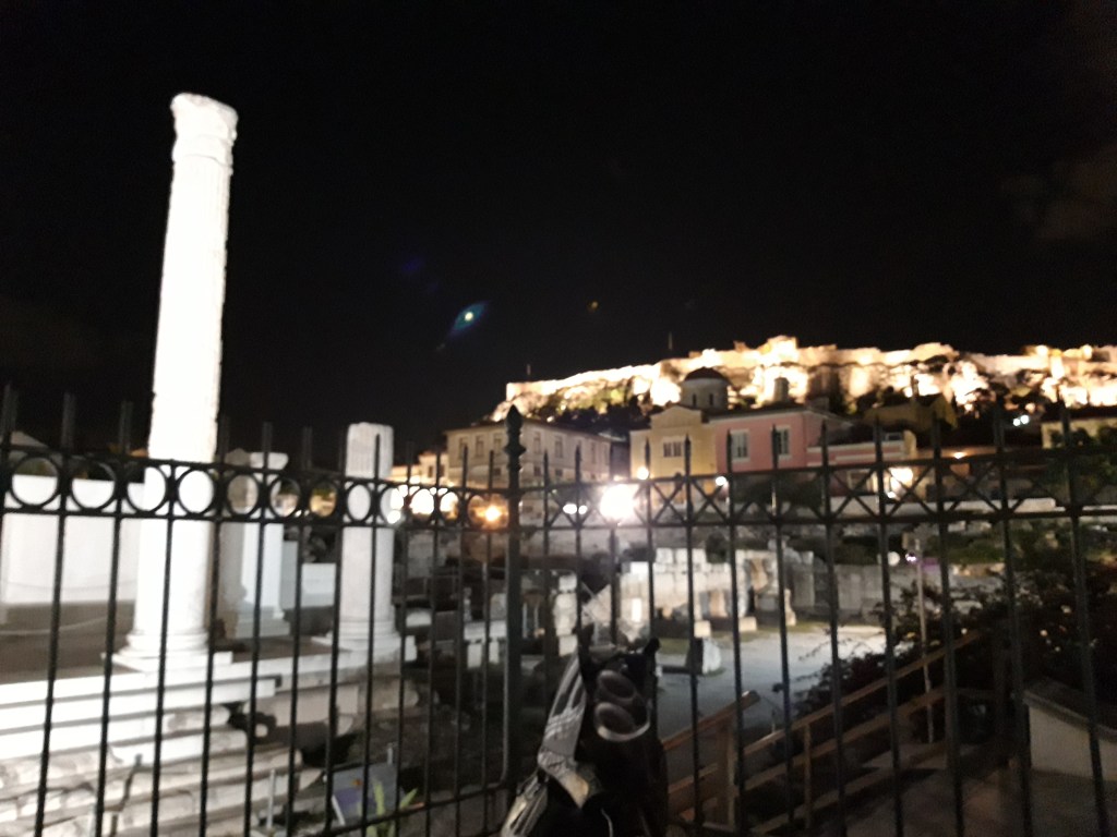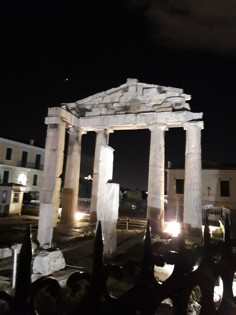 Un muzician stradal cânta la chitară melodii de Pink Floyd, lângă Biblioteca împăratului Hadrian (un colos de clădire, chiar și așa, împuținat de timpul care trecuse peste el). Luna și, pe fundal, silueta Acropolei dădeau scenei și mai mult farmec. Peste drum, din câte am putut desluși pe un indicator, se găsea Agora (piața publică) romană.