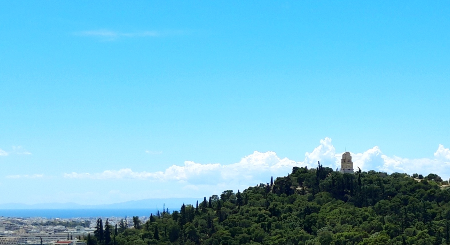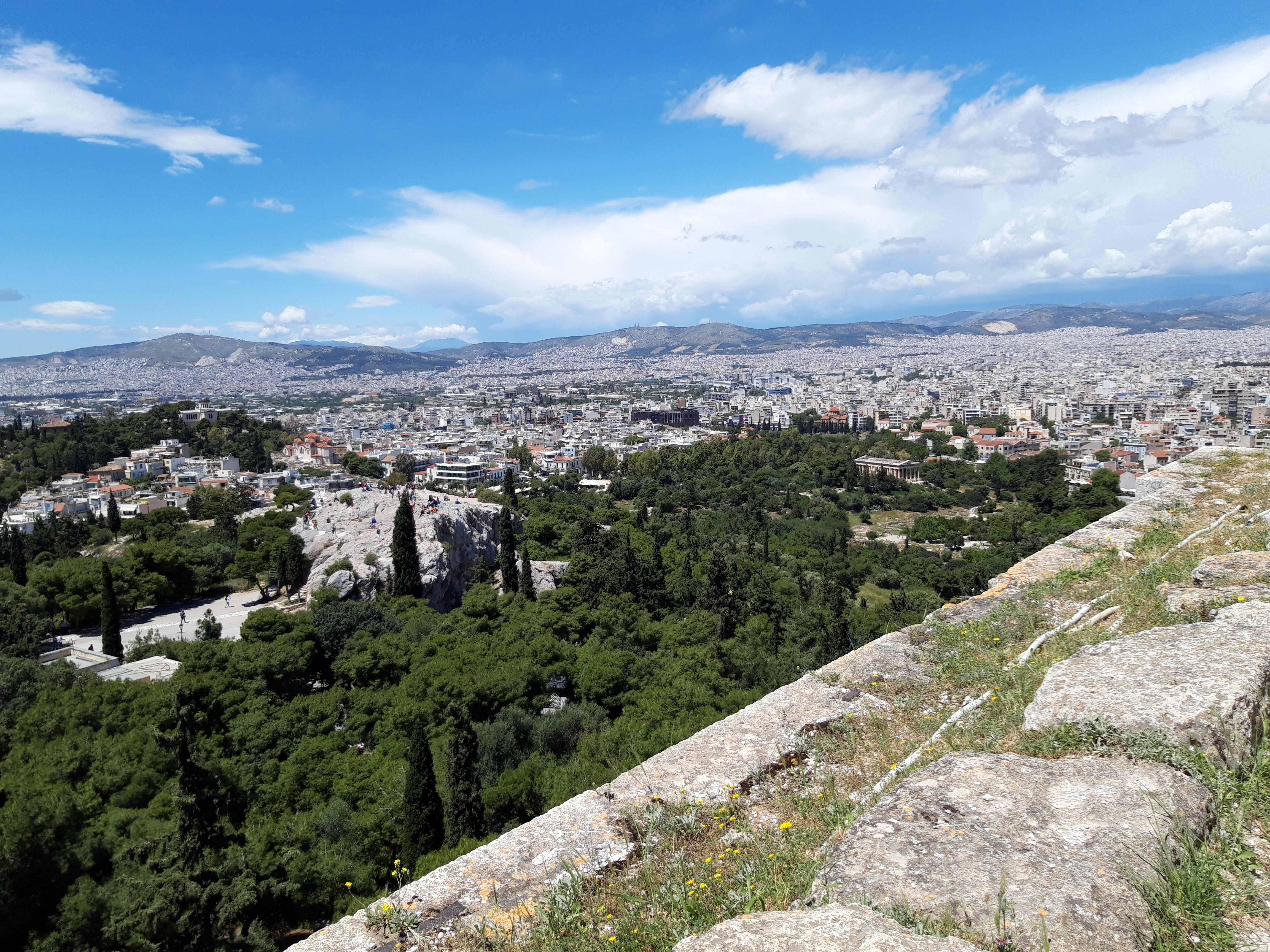 Pe măsură ce înaintam, lăsând în urmă arhitectura colorată din Plaka, ni se deschidea sub ochi panorama Atenei moderne, întinsă până în zare, spre munții Atticii, ditamai metropola. În apropiere, chiar sub versantul sudic, pe care ne aflam, puteam vedea ce mai rămăsese din vechea Agoră (piață publică) antică: pierdute printre măslini și chiparoși, doar câteva fundații ale clădirilor de odinioară… cu excepția micuțului templu al lui Hefaistos, păstrat intact, din sec. V î. Hr. și până azi, nu știu prin ce miracol. De aici, de sus, părea minion, cât o căsuță de păpuși.