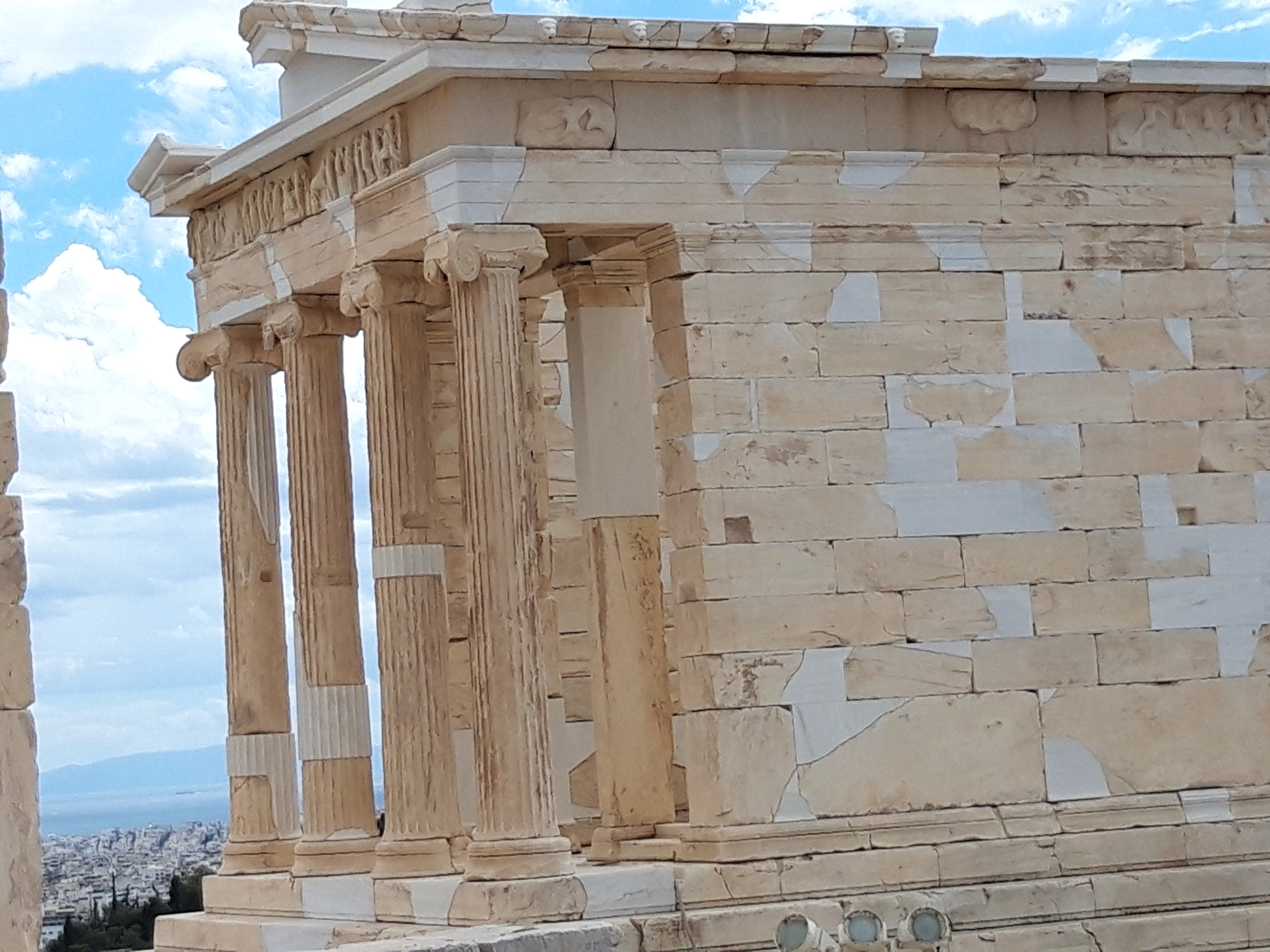 Primul templu pe care l-au reclădit atenienii, în sec. V î.Hr., după războiul cu perșii, a fost unul mititel, pe un colț de stâncă, în fața Propileelor (poarta de intrare în Acropole), cel al Atenei Nike (Victorioasa). M-a vrăjit total, atât e de frumos și de gingaș, un templu de buzunar.