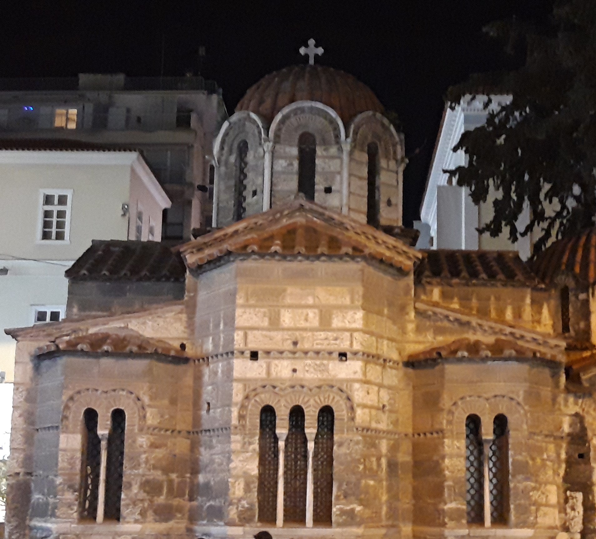Nu știu de ce se construiau, uneori, biserici atât de mici, în acea perioadă; am mai văzut unele similare și în Bulgaria. Poate resursele economice precare să fi fost de vină?… Atena, în era bizantină, și-a pierdut faima și bogăția de altădată, după ce împăratul Iustinian (sec. VI d.Hr.) a închis Academia lui Platon, pe motiv că era prea păgână, într-o lume devenită exclusiv creștină. Prestigiul orașului se întemeia, mai ales, pe școlile sale de filozofie, așa că, în lipsa acestora, Atenei nu i-a mai rămas nimic special: o așezare ca oricare alta. Au urmat cele două veacuri (VII-VIII d.Hr.) cunoscute drept „Epoca tenebrelor bizantină”, când viața urbană din Imperiu a cunoscut un declin major, iar populația cetății, mult diminuată, s-a ascuns în spatele fortificațiilor Acropolei, de teama invadatorilor (pe bună dreptate, de altfel, căci Atena a fost prădată, de mai multe ori, de goți, slavi și alte neamuri migratoare).