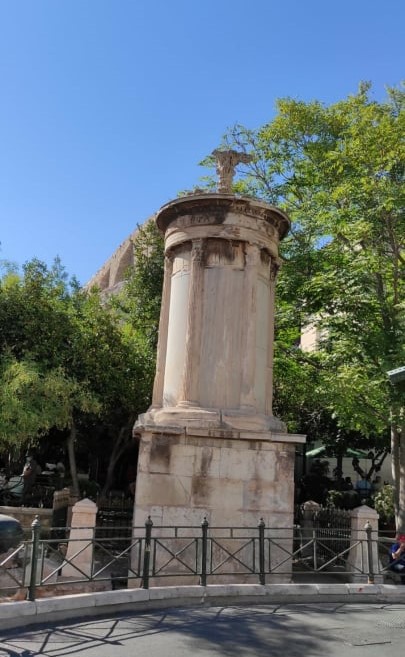 Traseul străzii a rămas neschimbat, de atunci și până acum, dar pavimentul original și clădirile antice s-au făcut praf și pulbere, între timp… cu o singură excepție: monumentul choregic al lui Lysicrate, un muzician din sec. IV î.Hr., care câștigase, împreună cu un cor de băieți, una din competițiile de care vă ziceam. Trepiedul lui s-a pierdut ori a fost furat, de-a lungul secolelor, dar construcția s-a păstrat surprinzător de bine și este cel mai vechi edificiu existent, la care să se fi folosit coloane cu capiteluri de ordin corintic, decorate cu frunze de acantă (sau pălămidă, pentru cei ce cunosc denumirile populare ale plantelor). Nu a împărtășit soarta tristă a tuturor celorlalte monumente choregice de pe stradă, pentru că a avut norocul să fie încorporat într-o mănăstire capucină și îngrijit de noii proprietari. Lordul Byron, poetul britanic, a poposit la această mănăstire și a folosit monumentul lui Lysicrate drept birou, pentru a-și scrie versurile.