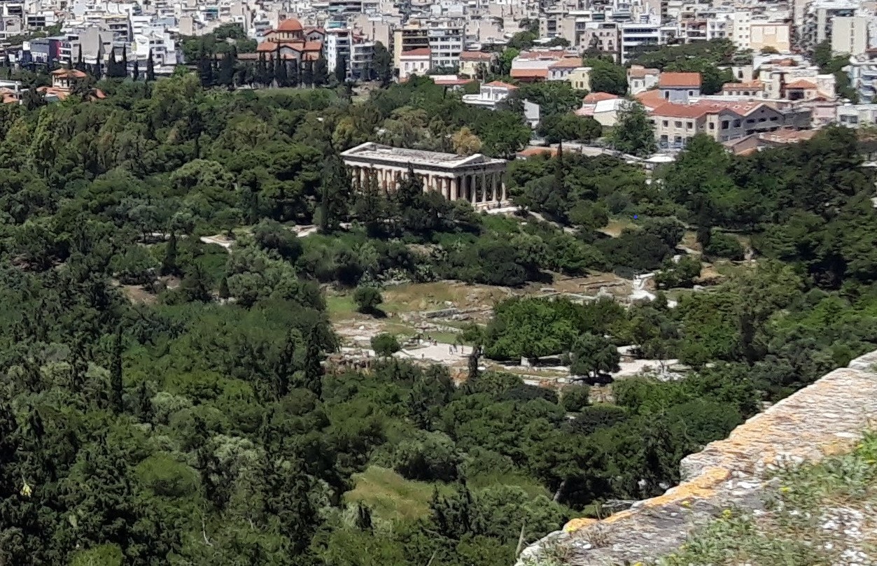 Pentru că a fost construit pe un mic pinten de deal, din dreptul Templului lui Hefaistos se putea vedea perfect toată Agora: în stânga, Templul lui Apollo Patroos și Gimnaziul, în spate (pe fundal), Stoa lui Attalos, și, în dreapta, ruinele Consiliului Magistraților (Boulé), canalul principal al sistemului de canalizare al Atenei antice (a cărui existență însăși e un mare semn de civilizație!), dar și Biserica bizantină a Sfinților Apostoli, din sec. X d.Hr. Dar cine domina, din zare, întreaga priveliște? Acropola, bineînțeles!
