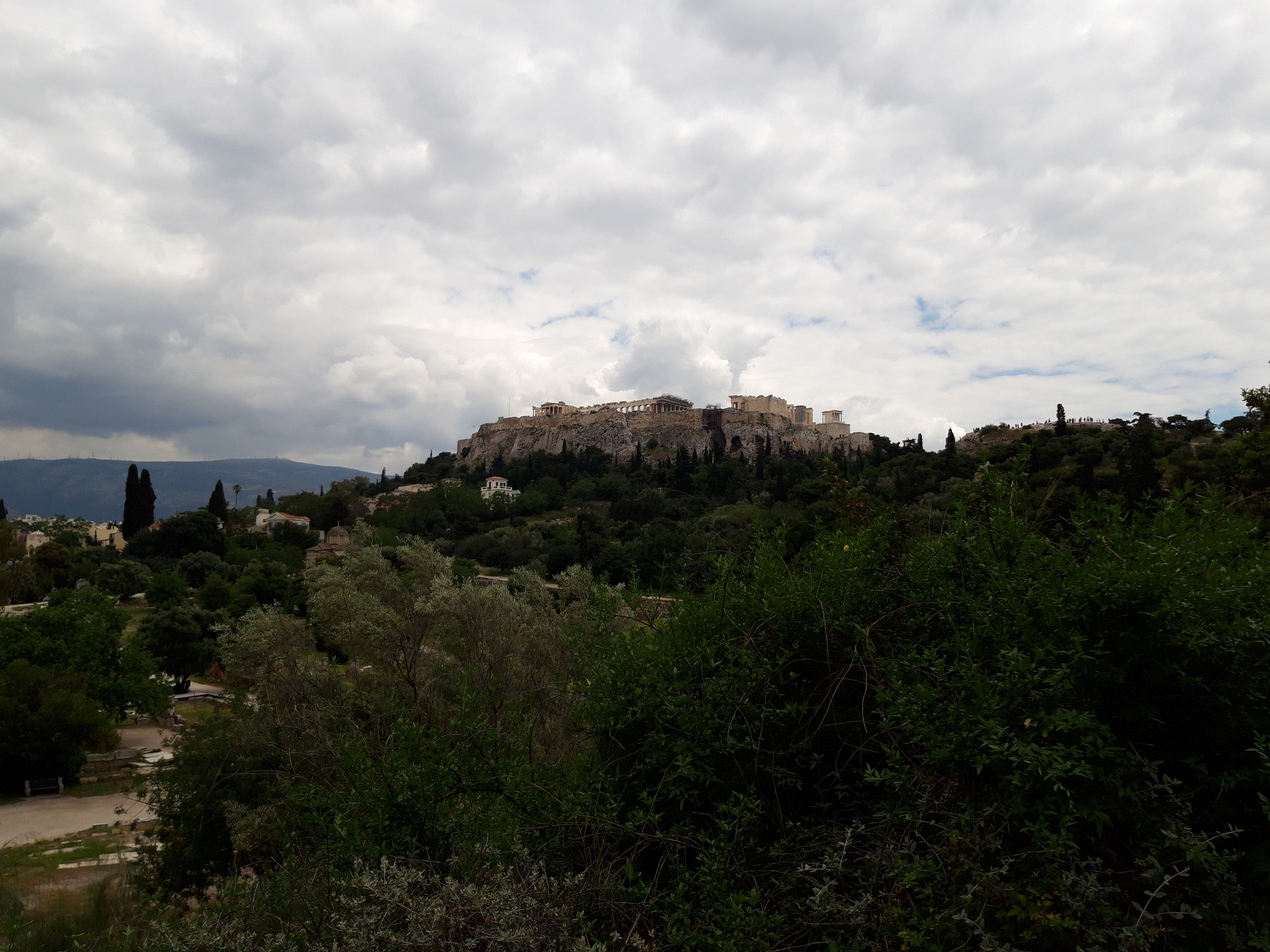 Ne-am continuat drumul, încercând să înțelegem ce vedeam. Dar era greu chiar și să ne imaginăm cum arătase odinioară piața centrală a Atenei: fiind vorba de clădiri mult mai vechi decât cele din Agora romană, din ele s-au păstrat doar fundațiile, risipite la umbra măslinilor și a chiparoșilor. Agora veche devenise o grădină liniștită. Fermecătoare. M-a dus, din nou, cu gândul la Arcadia, miticul ținut de o frumusețe neasemuită, din legendele grecești. Frunzișul se decupa dramatic, pe fundalul cerului înnorat (o atmosferă surprinzător de mohorâtă, după excesul de Soare, de până atunci). Verdele părea culoarea dominantă, în acest mic univers, și, din câte am înțeles, când a fost amenajat situl, au fost plantate numai specii care existau și în epoca antică, pentru un plus de autenticitate.