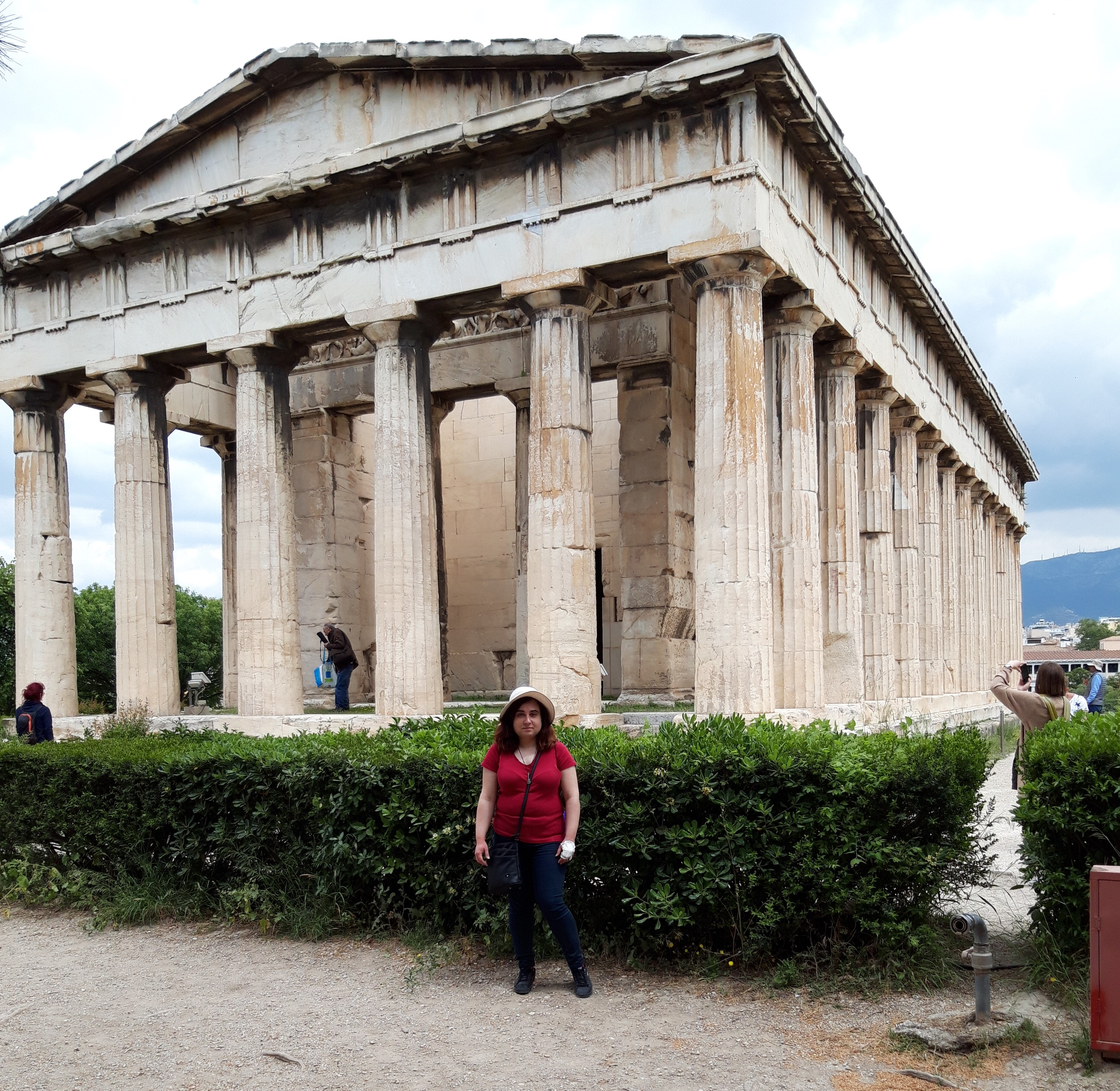 Ne-a atras atenția un templu mititel, parcă ascuns între copaci, situat diametral opus față de Stoa lui Attalos, în capătul celălalt al Agorei – și am pornit într-acolo. Dar, pe drum, ne-a mai atras și altceva atenția: am trecut pe lângă resturile fațadei monumentale ale Gimnaziului (nu e vorba de o școală secundară, ci de o sală de sport, unde se antrenau tinerii atleți). Constructorii din sec. II d.Hr. s-au folosit de o inovație arhitectonică; au sprijinit acoperișul porticului de la intrare nu pe clasicele coloane, ci pe echivalentul masculin al Cariatidelor: niște statui de Giganți și Tritoni (zei marini, reprezentați ca fiind pe jumătate oameni, pe jumătate pești).