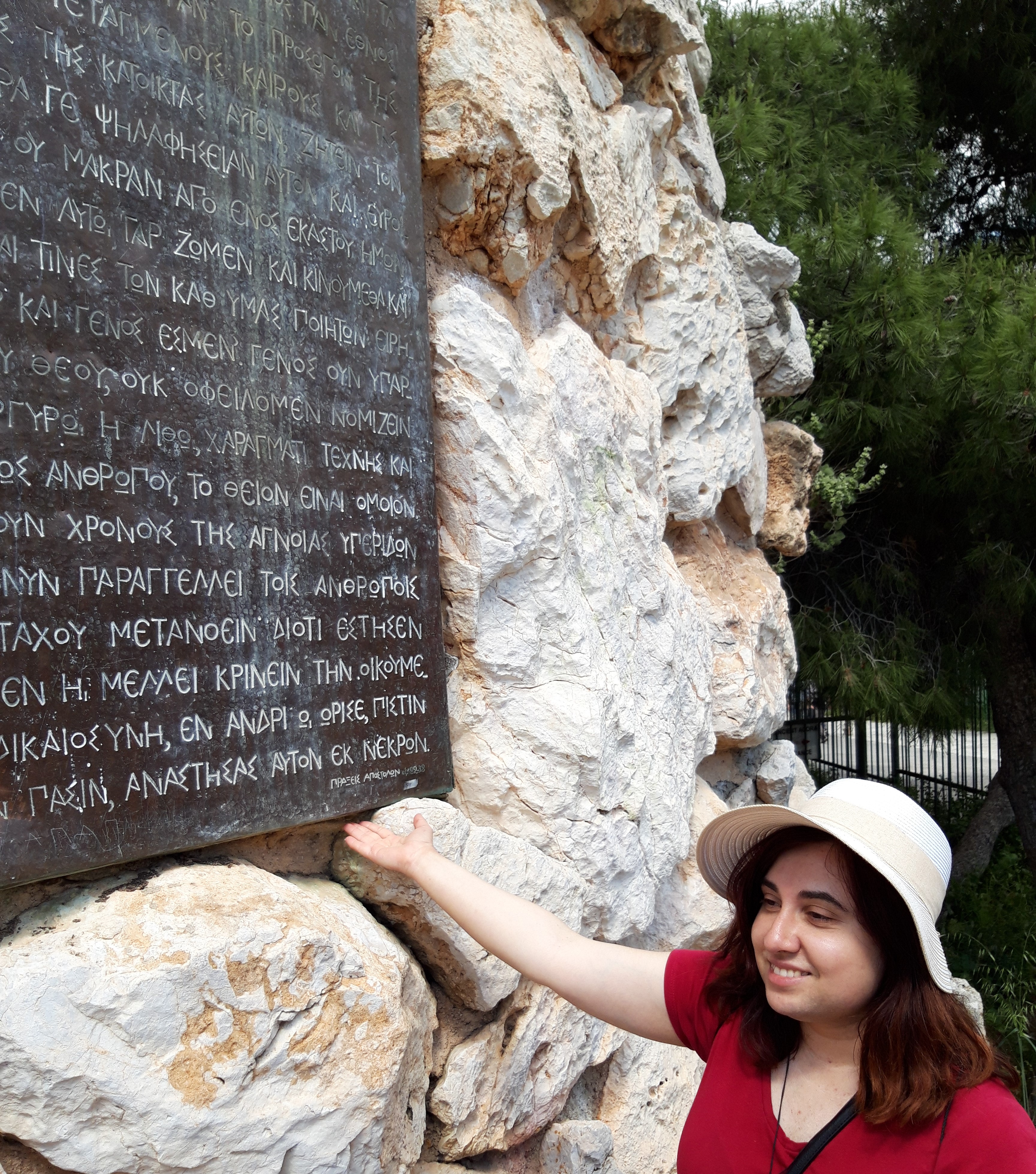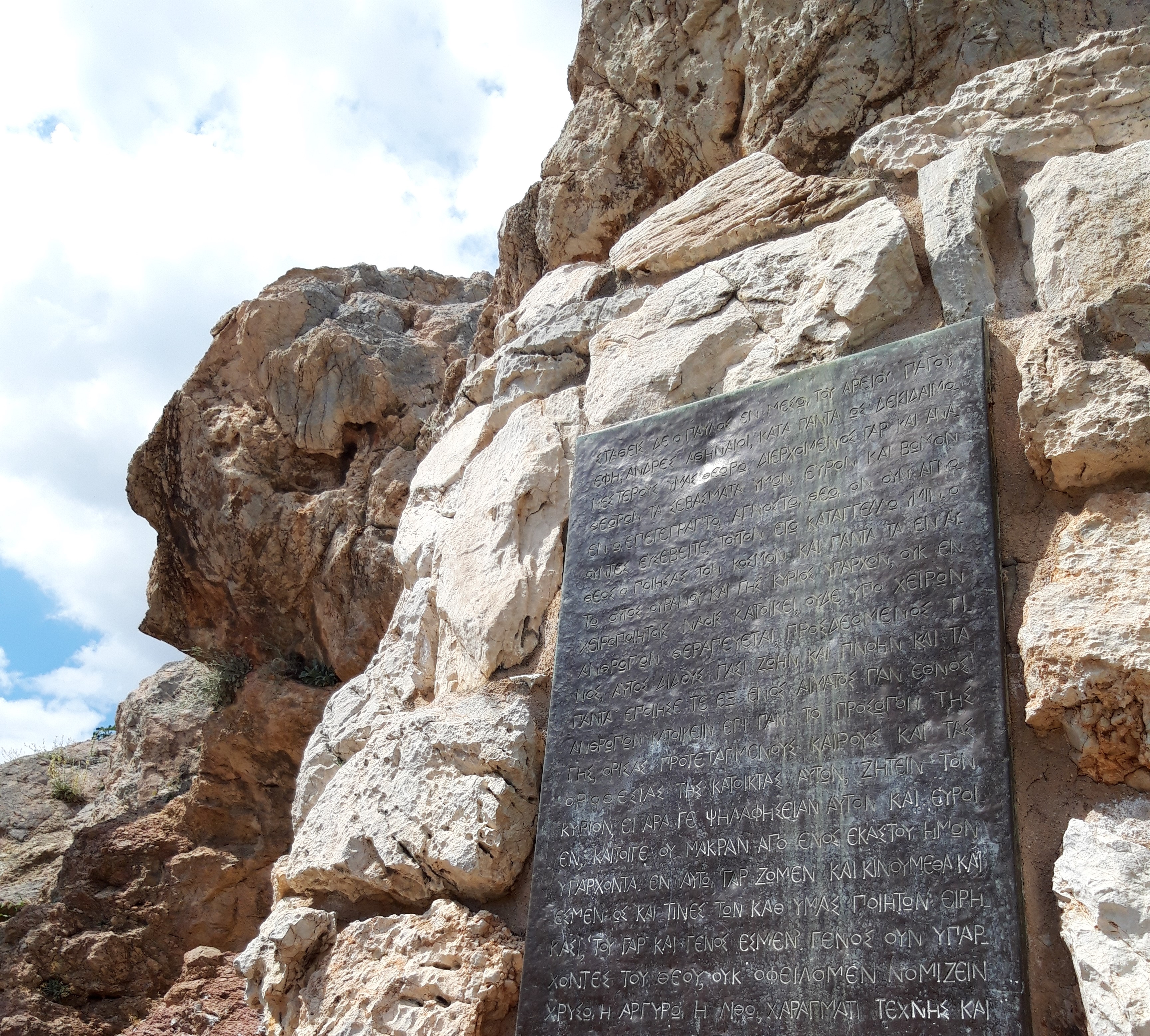 La Areopag, Sfântul Pavel a propovăduit Evanghelia și, pe o placă de metal prinsă de stâncă, a fost gravat textul din Biblie al cuvântării pe care a ținut-o el. Textul este, evident, în limba greacă, dar cei care vor dori să o citească o pot găsi, împreună cu relatarea șederii Apostolului la Atena, aici: Fapte 17, 15-34.