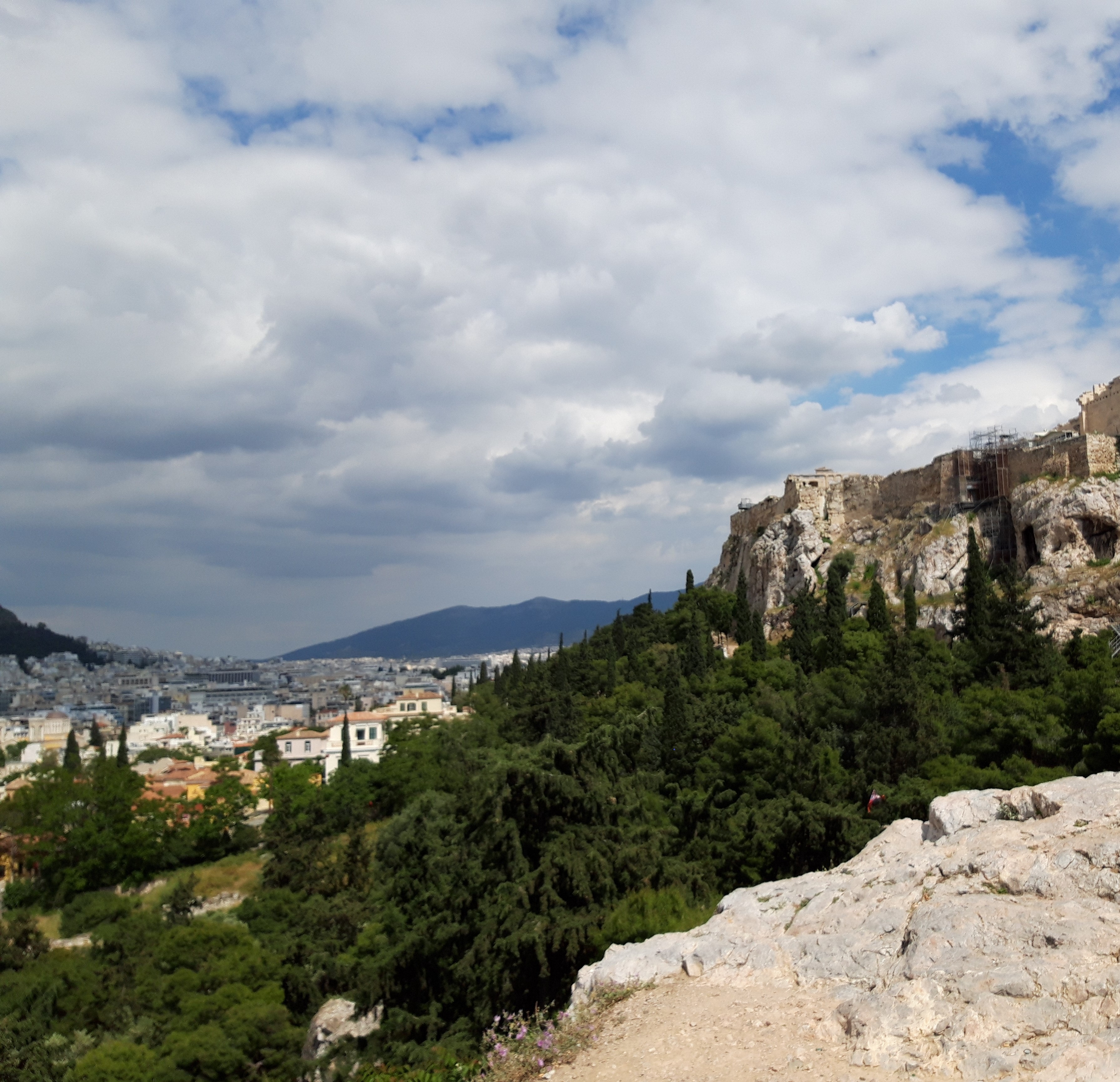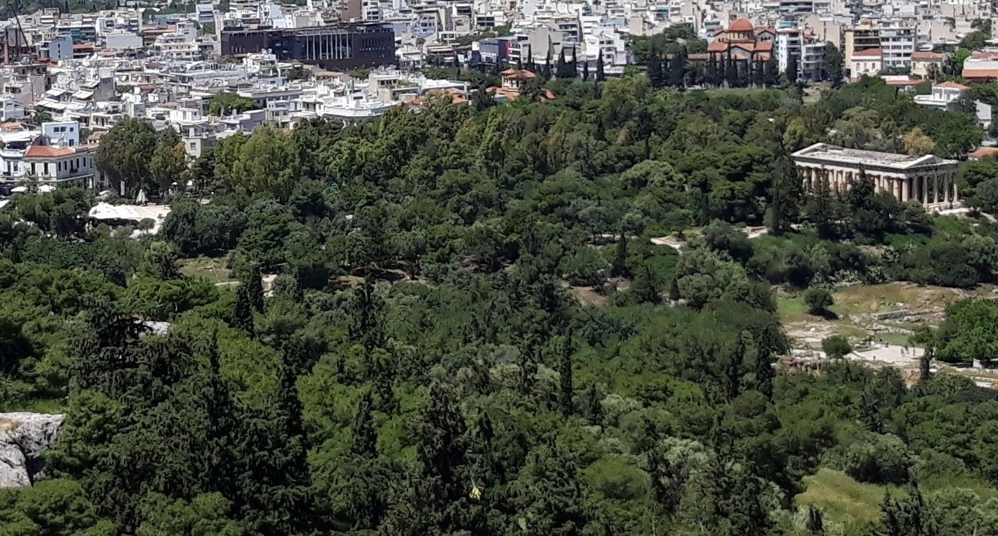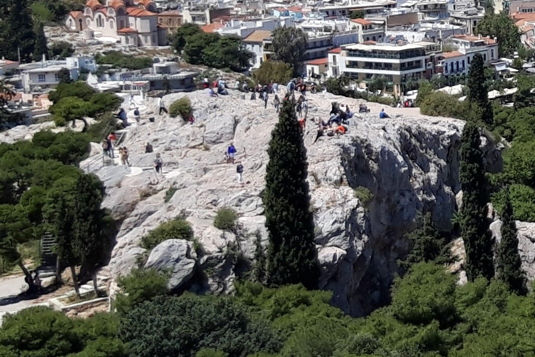 Când vezi Areopagul de jos, de la baza lui, printre copaci, e greu să îți dai seama că nu ai de-a face cu un pietroi oarecare, ci cu un ditamai pintenul stâncos, destul de înalt (115 m), lipit de coasta nord-vestică Acropolei (motiv pentru care, cu o zi înainte, când trecusem pe lângă el, habar nu avusesem la ce ne uitam). Forma și dimensiunile Areopagului pot fi înțelese mai bine, de sus, de pe Acropole (cum se poate vedea și în fotografiile alăturate).