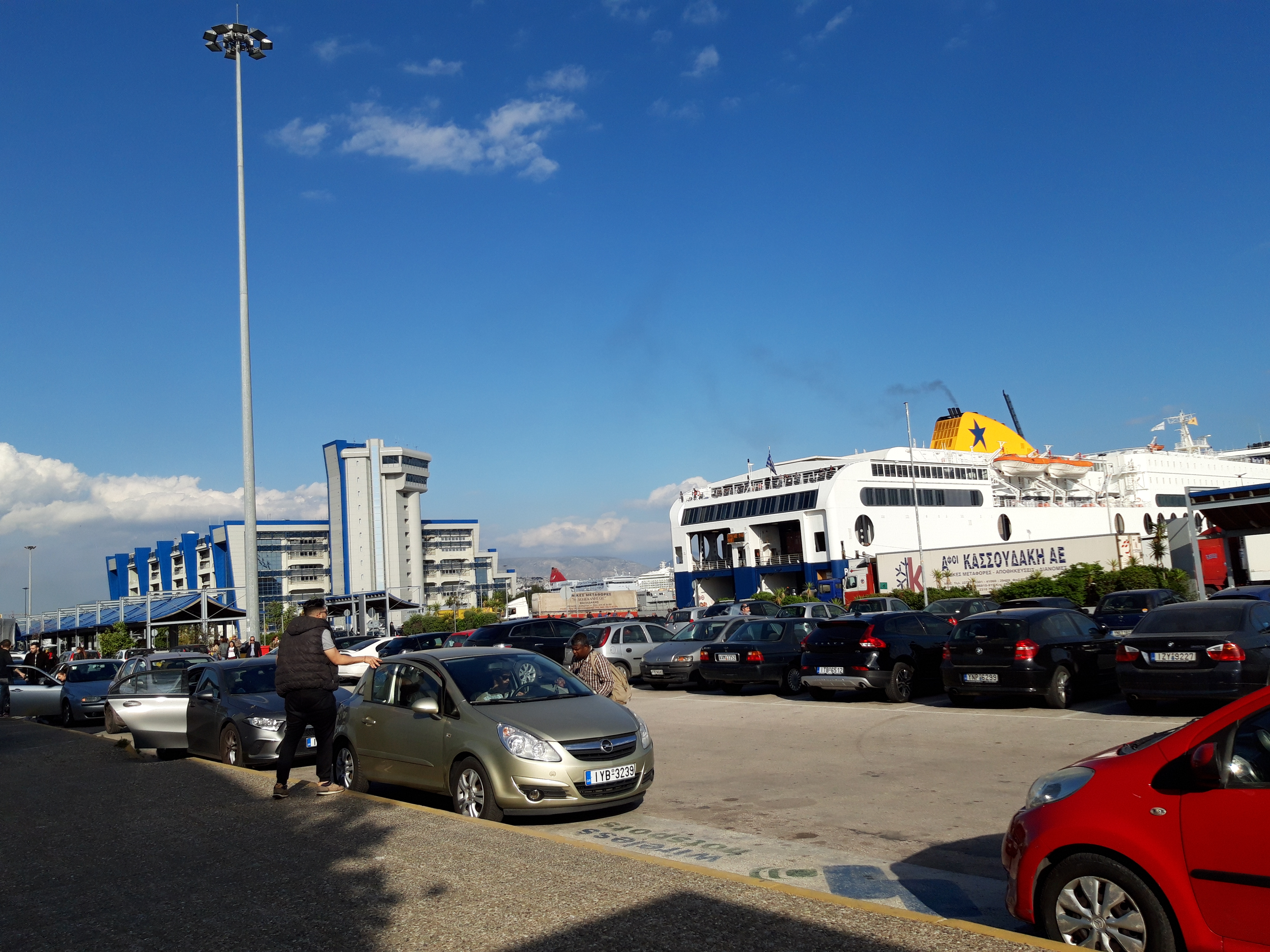 Taxiul ne-a lăsat în dreptul terminalului operat de compania Blue Star Ferries, specializată în transportul naval între Grecia continentală și multitudinea de insule (Ciclade, Sporade ș.a.m.d.) din Marea Egee. O dezamăgire: sperasem ca acest terminal să se afle în zona centrală a Pireului, ca să avem pe unde să ne plimbăm, să explorăm și, poate, să găsim și ceva comestibil (de la micul dejun, nu mai mâncasem și eram, cum se poate bănui, morți de foame). Dar nicio șansă! Era situat foarte departe, spre ieșirea din oraș, cam pe unde se sfârșea cheiul din Kantharos. Și nu era nimic, în preajmă: dincolo de un parapet, doar șoseaua și un cartier rezidențial, cocoțat pe un versant. Nici vorbă de restaurante, cafenele, nici măcar cel mai amărât stand de gyros (echivalentul local de shaorma)… Cam neplăcut.