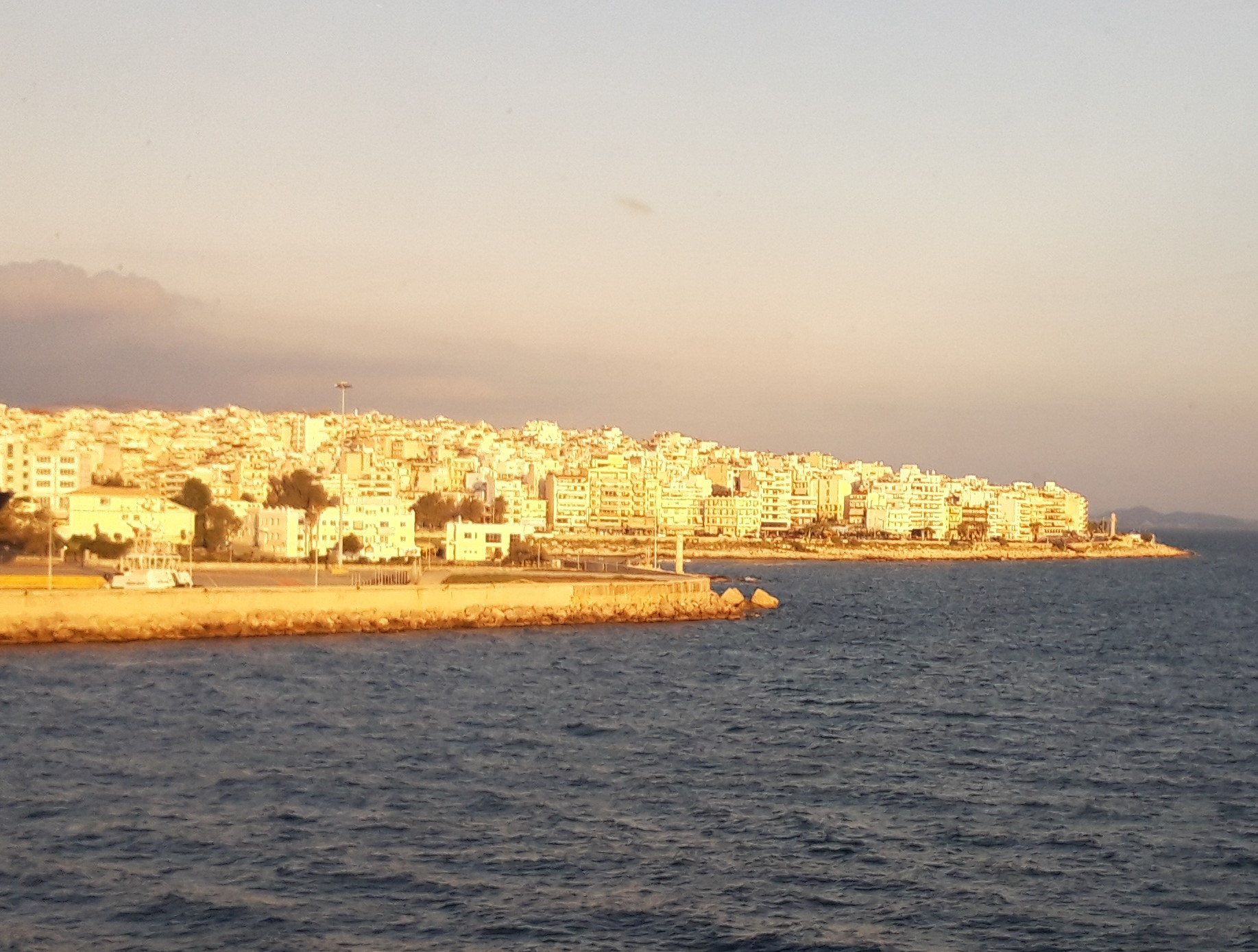 Am apucat să vedem doar un pic din Pireu, în goana mașinii: o aglomeratie de blocuri și căsuțe, mai toate albe, cu un aer vesel, mediteranean, trântite claie peste grămadă, una în capul alteia, pe piepții unor munți pitici, care se opreau abia în buza mării. Dar nu ele dominau priveliștea, ci apele Golfului Saronic (pe atât de albastre pe cât ne așteptam să fie) și vasele uriașe, de croazieră, ancorate la țărm.